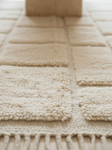 Ce tapis berbère écru, orné d’un motif en relief géométrique inspiré des carreaux traditionnels marocains, est une véritable pièce d’exception.