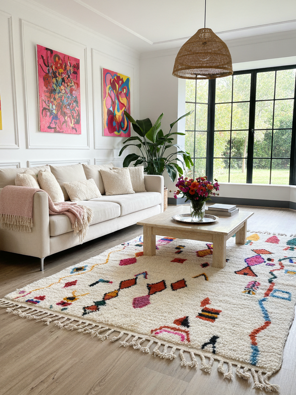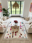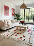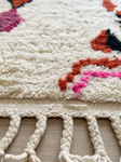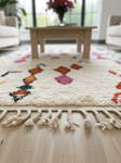 On a soft and luminous ecru base, abstract and symbolic patterns emerge in bright colors — pink, green, orange, blue, red and yellow — evoking nature, joy and the imagination of Berber craftswomen.